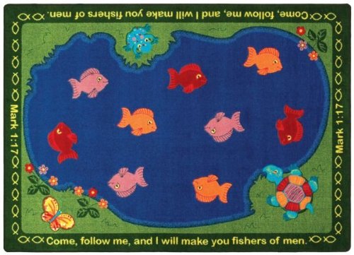 This Fishers of Men Carpet is a fun and cheerful way to teach children about Jesus's plan for his disciples. They will love the colorful fish, and they'll also love learning the important Bible verse. Perfect for Sunday schools or playrooms!Sizes available 3 feet 10 inches x 5 feet 4 inches 5 feet 4 inches x 7 feet 8 inches (oval) 5 feet 4 inches x 7 feet 8 inches (rectangular) 7 feet 8 inches x 10 feet 9 inches (oval) 7 feet 8 inches x 10 feet 9 inches (rectangular) 10 feet 9 inches x 13 feet 2 inches (oval) 10 feet 9 inches x 13 feet 2 inches (rectangular)This carpet features SoftFlex backing, which is an air-texturized, polypropylene secondary backing that's designed to withstand the most demanding situations. SoftFlex is woven tightly, yet is still extremely flexible, which helps eliminate wrinkles and provide superior protection and insulation underfoot.JoyTuff carpets are Stainmaster-protected and ideal for home or office use. They are constructed from Stainmaster BCF Type 6,6 two-ply nylon, and feature advanced protection against stain and soil, as well as Impervion mold and mildew protection. This carpet is bound and serged for maximum durability and features a SoftFlex back, plus a Class I Flammability rating. To maintain, simply vacuum regularly and use hot water extraction cleaning as required.This carpet includes the following warranties: Lifetime limited wear warrantyLifetime limited antimicrobial protectionLifetime limited static protection10-year limited dual technology soil and stain protectionDedicated to Environmental Stewardship Joy Carpets understands the importance of environmental stewardship and its relationship to a successful business. We are committed to operating our facilities in an environmentally sustainable manner, and in a manner that protects the health and safety of our associates and the public.Our environmental commitment is driven by a holistic approach to sustainable operations, not simply focusing on recycling alYou will not be disappointed with